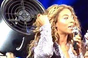 The singer crouched down on the edge of the stage at the Bell Centre in Montreal on Monday to belt out the ballad when her long locks got swept up into the blades of an industrial-sized fan positioned in front of the audience pit.