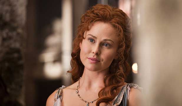 Even after long hours of filming Spartacus: War Of The Damned, the diminutive actress is still delighted to chat about everything from her flame-red wig – “It’s outta control! I come in at 5am and get my wig put on and leave at 7.30pm and be blonde again” – to the three-week bootcamp she had to do with the stunt team before taking the role of Laeta.