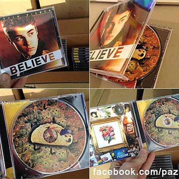 The wrapped CDs resemble Believe right down to the bar code and silky Bieber portrait on the cover. However, Paz’s artwork is on the inside of the back cover, and the disc itself is slathered with images of cats, pizzas and a dog stuffed inside a taco.
