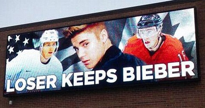 A company in Illinois paid for a large billboard ahead of the high-stake hockey game between the US and Canada in Sochi, poking fun at the star-crossed teen idol, DNAInfo Chicago reported.
