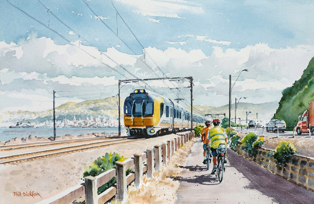 Dickson’s sketches and oil and watercolour paintings cover the oddly familiar in Wellington – Sunday in Bowen St, a morning view from Thompson St, the Hutt Rd cycleway with a lonely couple of cyclists and a passing train, Brooklyn Galleria with the Penthouse Cinema in the background, a wet day in Aro St, the city and harbour from Brooklyn on a winter afternoon, a couple of lady artists sketching tulips in the sun in the Botanic Garden.