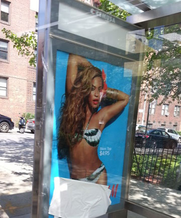 According to New York blog Bowerie Boogie, a bus stop billboard of Beyonce sizzling in a barely there bikini was covered up then removed. One reader told the website: