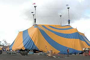 The trademark blue-and-yellow big top tent, sitting more than 2600 people, was raised today at Alexandra Park. It stands 19 metres high and is 51 metres in diameter.