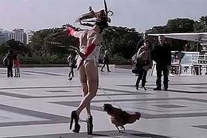 Steven Cohen wore red satin gloves, platform shoes and a feather headdress as he walked around the popular tourist spot with the rooster attached to his genitals by a white ribbon.