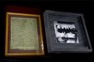 The album cover is part of an installation next to one of the four remaining copies of the 1215 Magna Carta in Salisbury Cathedral, England.