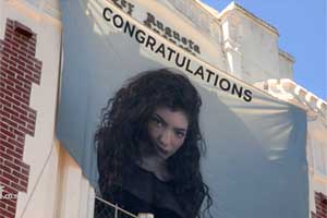 Classmates and teachers at Takapuna Grammar celebrated Lorde’s two Grammy awards with a large “congratulations” banner hoisted in her honour today, with back-to-school students buzzing about their friend’s win.