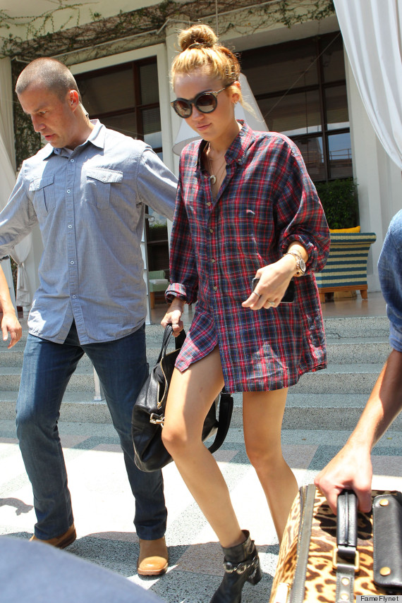 How many Hollywood starlets are following  Ga Ga’s trend and going out without wearing any bottoms? . Thursday,  the newly engaged Miley Cyrus was seen exiting her Miami hotel in an over-sized plaid shirt and not much else.