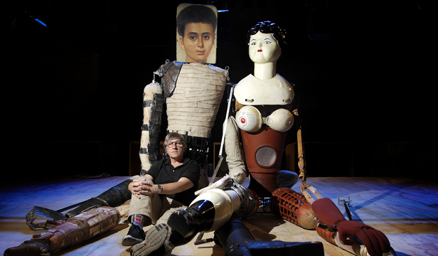 Which explains a little about why the six-metre high puppets used in the production are made of dozens of discarded objects haphazardly held together with tape and glue.