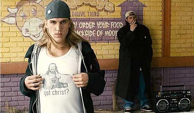 As the primary recurring characters in the View Askewniverse (named after Smith’s production company, View Askew Productions), Jay is played by Jason Mewes, and Silent Bob is Smith himself. Bob communicates mostly through hand gestures and facial expressions, but occasionally breaks out of his laconic default to make profound speeches or to call Jay a ‘dumb fuck’ when it’s needed (see link: Jay and Silent Bob Strike Back, 2001).