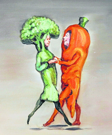 MUST SEE Dance Cards – Joanna Braithwaite, Bowen Galleries Joanna Braithwaite’s small, warm and witty paintings of dancing couples in ridiculous costumes in the gallery window are elegant and telling. Offering clever and delightful pairings as a dancing alphabet, they’re both nostalgic and playfully slippery in their theatrical, hokey dressing up of people as everything from broccoli flowers to smoking cigarettes.