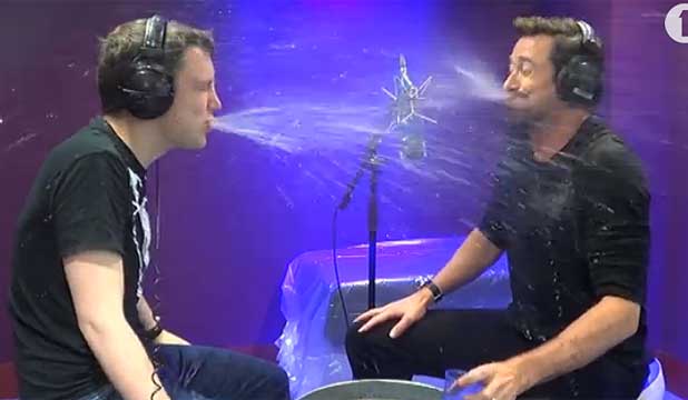 Oh, and they’re also facing each other, which means the risk of bursting out in laughter results in splashing your opponent with H2O. Hugh played the game with British radio personality Chris Stark (you may remember him as the awkward journo who interviewed Mila Kunis and talked more about his local football club than the movie she was promoting), while Kylie filled in for regular host Scott Mills.