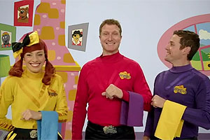 Emma, Simon and Lachy the Yellow, red and Purple Wiggles, are seen in the video with towels placed over their arms like waiters.